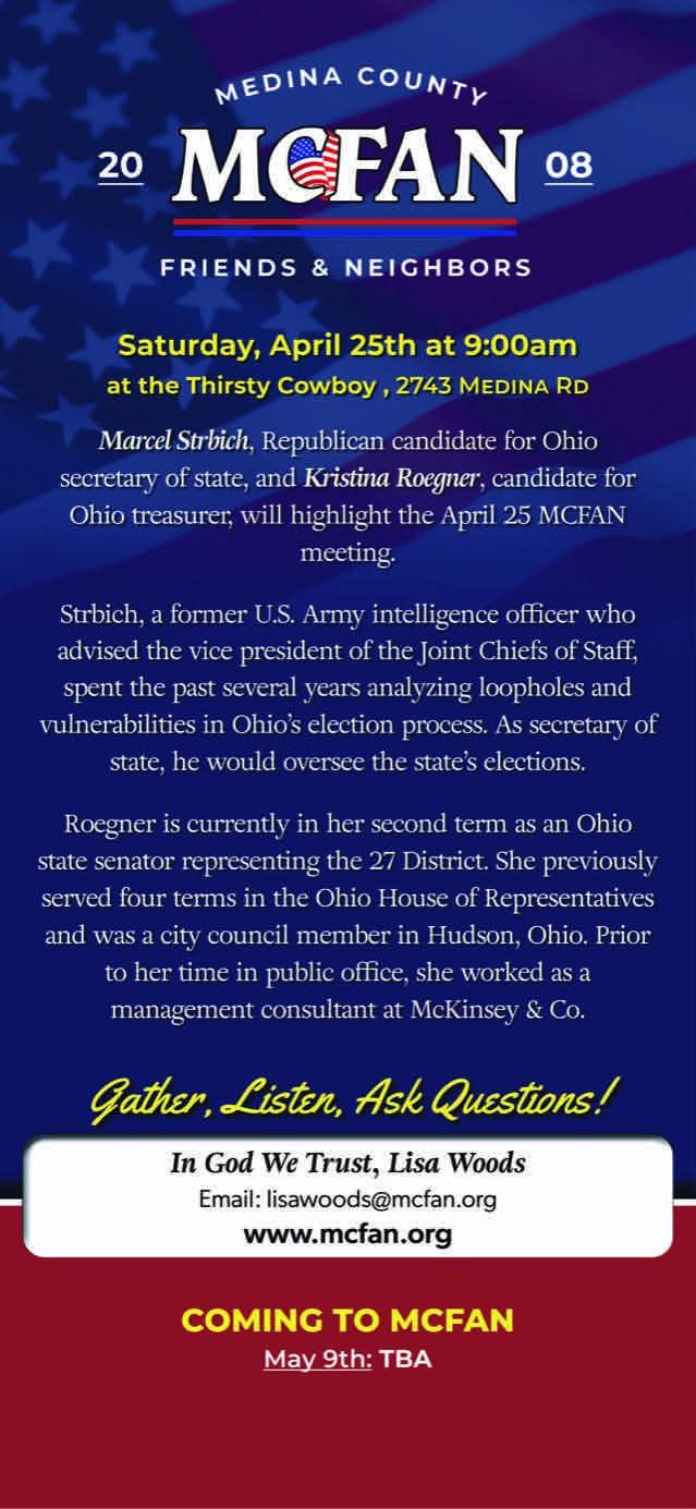 Congrats to Lisa and MCFAN on 15 years of hosting conservative conversations and providing grassroots support to keep our Medina County community strong by electing leaders who share our values.